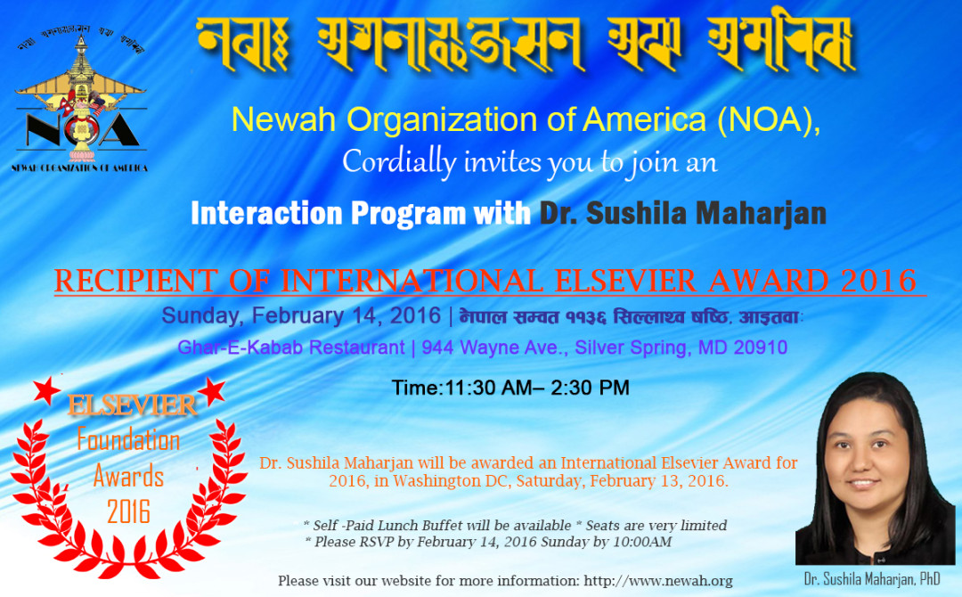 The Newah Organization of America (NOA) cordially invites you to meet and congratulate Dr. Sushila Maharjan, Ph.D., recipient of the prestigious The Elsevier Foundation Awards. The award has been selected on the Biochemistry and Biotechnology category within Central and South Asia Region. Dr. Maharjan, is a Research Director and Founding member at Research Institute for Bioscience and Biotechnology RIBB, Kathmandu, Nepal. She is currently in Washington DC to receive The Elsevier Foundation Award.